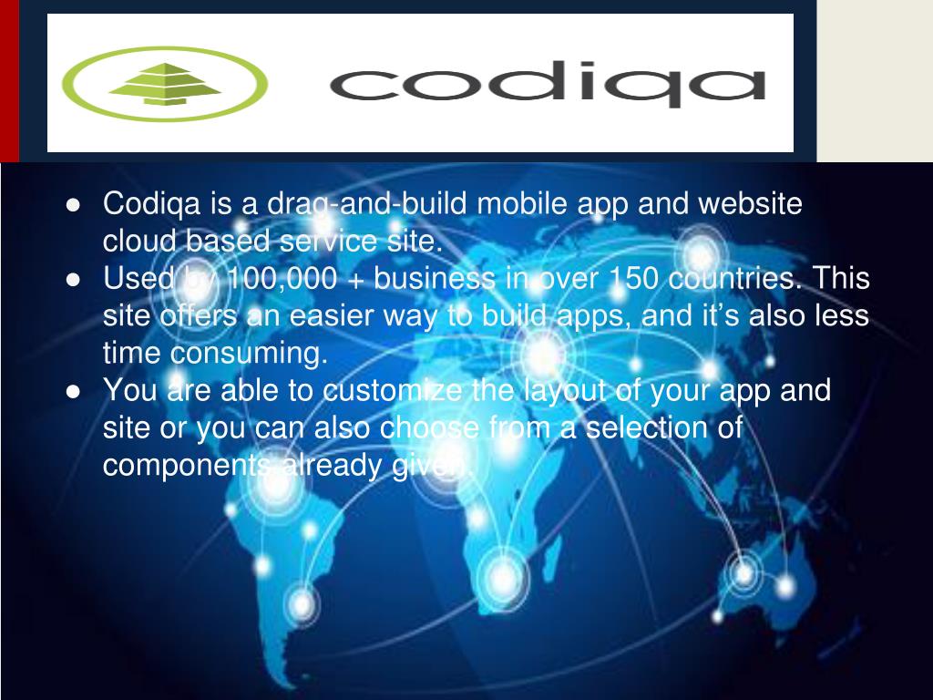 Codiqa is a drag-and-build mobile app and website cloud based service site. • Used by 100,000 + business in over 150 countries. This site offers an easier way to build apps, and it’s also less time consuming. • You are able to customize the layout of your app and site or you can also choose from a selection of components already given.