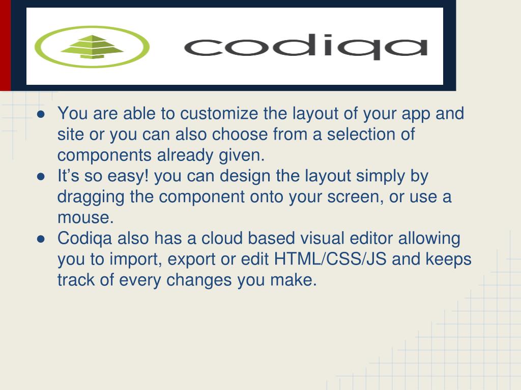 You are able to customize the layout of your app and site or you can also choose from a selection of components already given. • It’s so easy! you can design the layout simply by dragging the component onto your screen, or use a mouse. • Codiqa also has a cloud based visual editor allowing you to import, export or edit HTML/CSS/JS and keeps track of every changes you make.