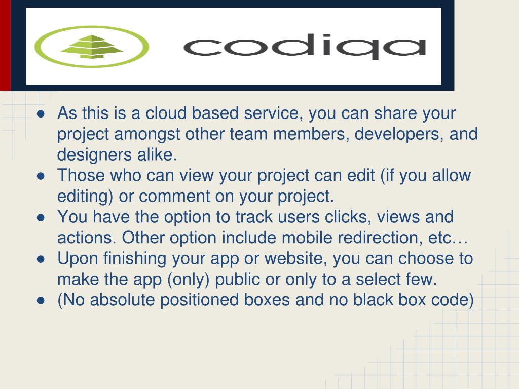 As this is a cloud based service, you can share your project amongst other team members, developers, and designers alike. • Those who can view your project can edit (if you allow editing) or comment on your project. • You have the option to track users clicks, views and actions. Other option include mobile redirection, etc… • Upon finishing your app or website, you can choose to make the app (only) public or only to a select few. • (No absolute positioned boxes and no black box code)