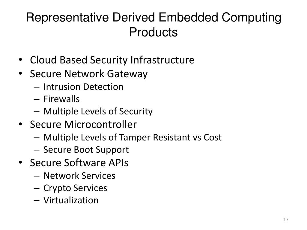 Representative Derived Embedded Computing Products • Cloud Based Security Infrastructure • Secure Network Gateway • Intrusion Detection • Firewalls • Multiple Levels of Security • Secure Microcontroller • Multiple Levels of Tamper Resistant vs Cost • Secure Boot Support • Secure Software APIs • Network Services • Crypto Services • Virtualization