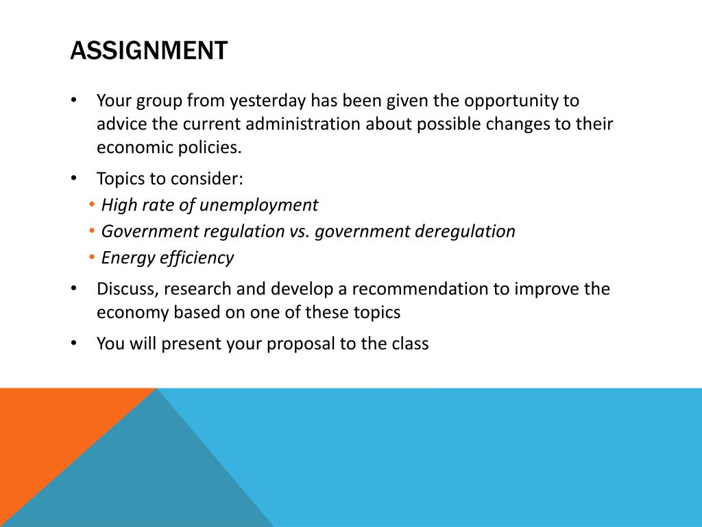 Assignment • Your group from yesterday has been given the opportunity to advice the current administration about possible changes to their economic policies. • Topics to consider: • High rate of unemployment • Government regulation vs. government deregulation • Energy efficiency • Discuss, research and develop a recommendation to improve the economy based on one of these topics • You will present your proposal to the class