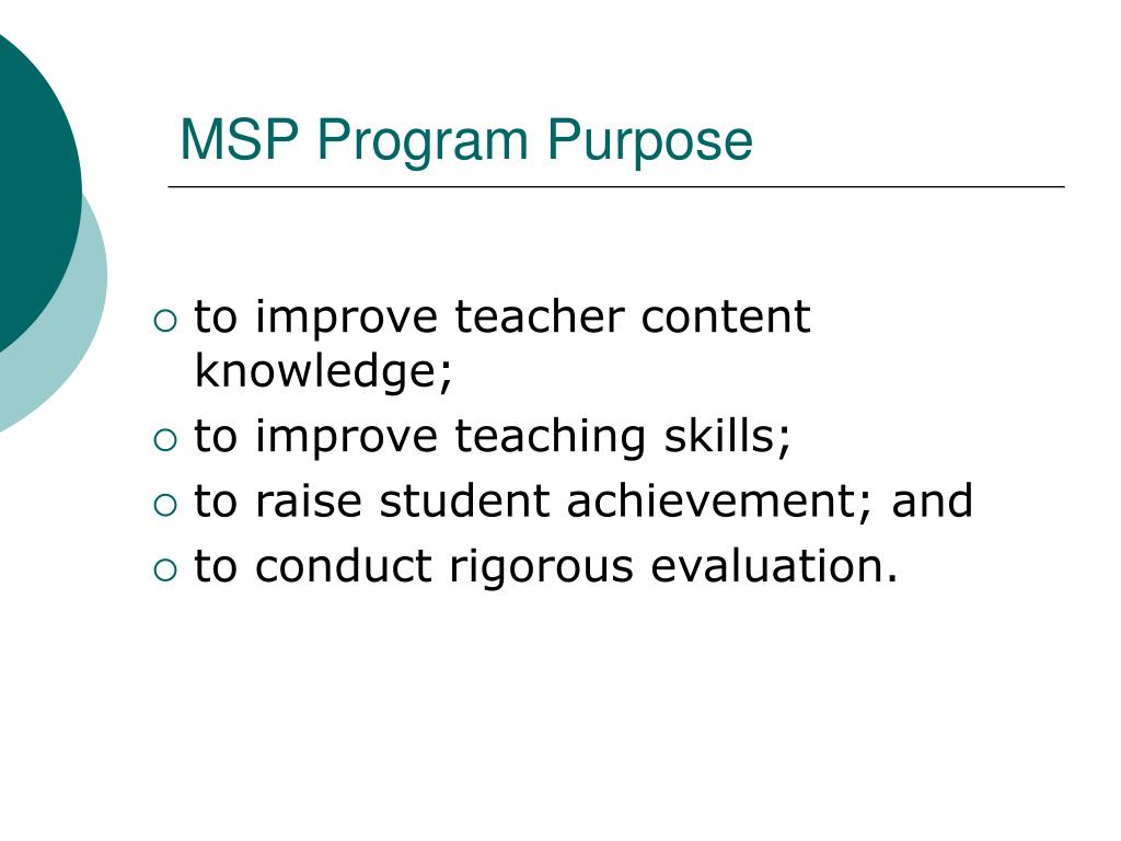 MSP Program Purpose • to improve teacher content knowledge; • to improve teaching skills; • to raise student achievement; and • to conduct rigorous evaluation.
