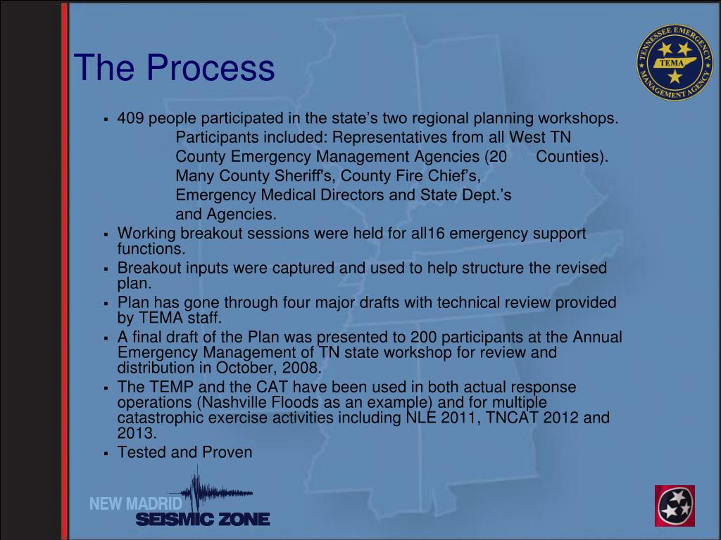 The Process • 409 people participated in the state’s two regional planning workshops. Participants included: Representatives from all West TN County Emergency Management Agencies (20 Counties). Many County Sheriff's, County Fire Chief’s, Emergency Medical Directors and State Dept.’s and Agencies. • Working breakout sessions were held for all16 emergency support functions. • Breakout inputs were captured and used to help structure the revised plan. • Plan has gone through four major drafts with technical review provided by TEMA staff. • A final draft of the Plan was presented to 200 participants at the Annual Emergency Management of TN state workshop for review and distribution in October, 2008. • The TEMP and the CAT have been used in both actual response operations (Nashville Floods as an example) and for multiple catastrophic exercise activities including NLE 2011, TNCAT 2012 and 2013. • Tested and Proven