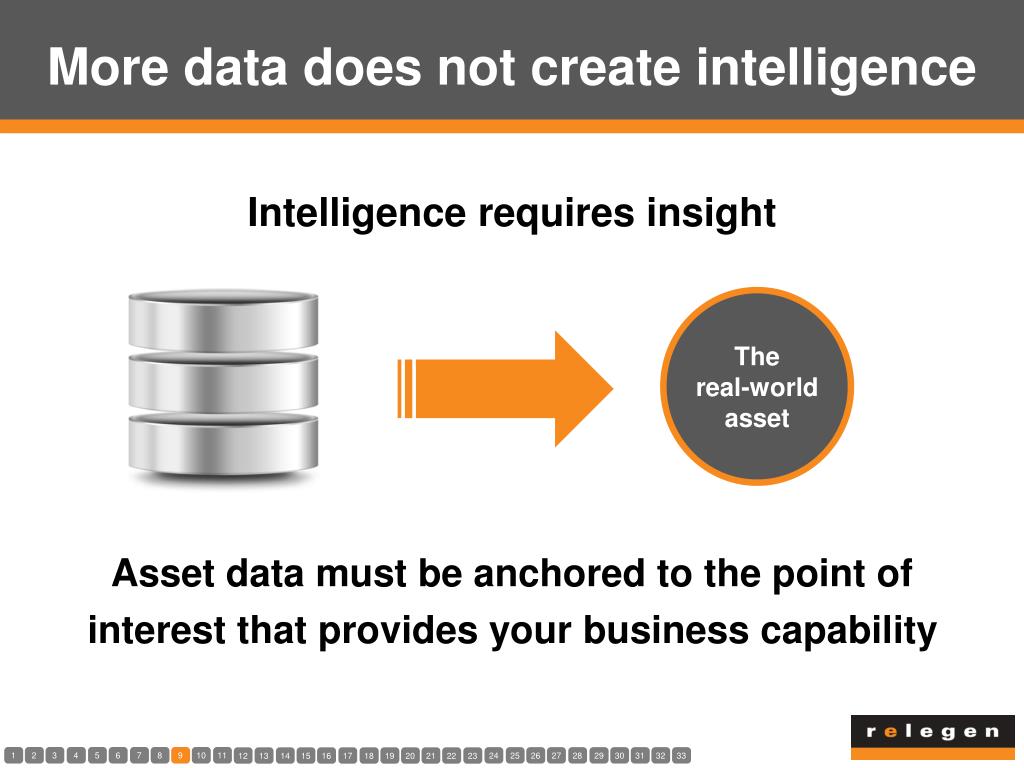 More data does not create intelligence Intelligence requires insight Thereal-world asset Asset data must be anchored to the point of interest that provides your business capability 1 2 3 4 5 6 7 8 9 10 11 24 25 26 27 28 29 30 31 32 33 13 14 15 16 17 18 12 19 20 21 22 23
