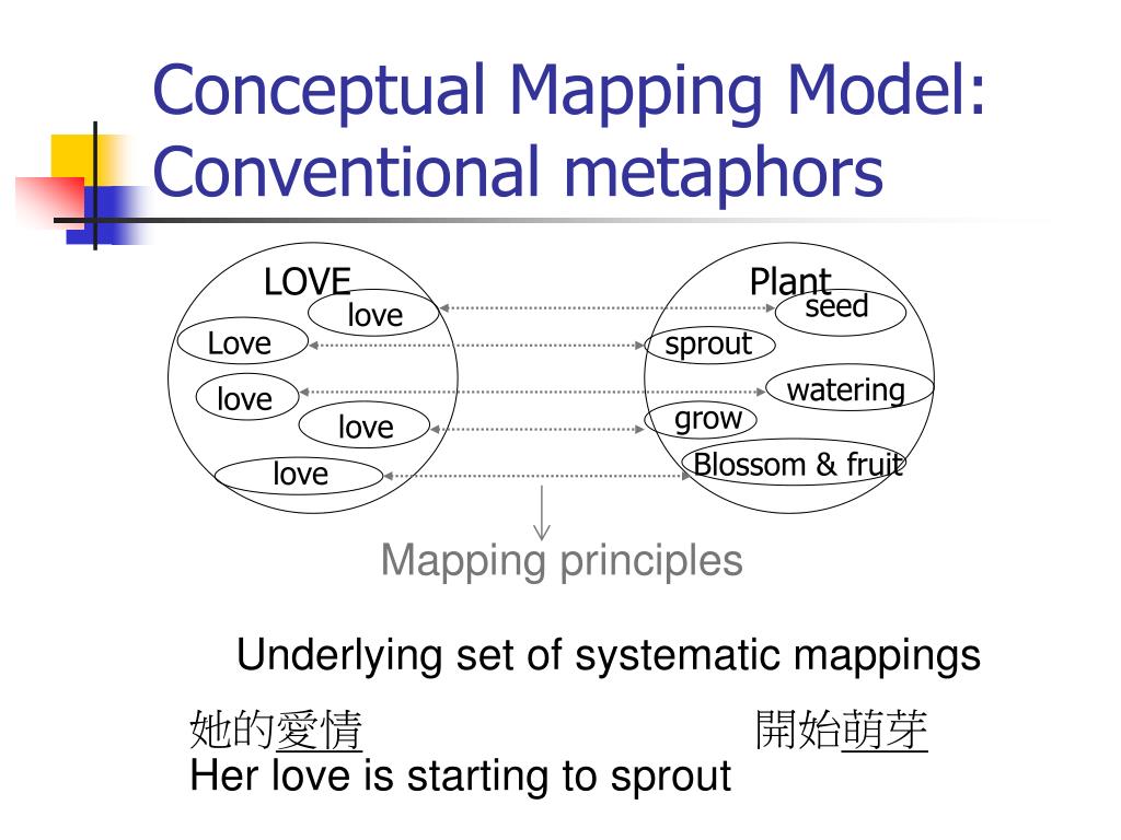 Conceptual Mapping Model:Conventional metaphors LOVE Plant seed love Love sprout watering love grow love Blossom & fruit love Mapping principles Underlying set of systematic mappings 她的愛情 開始萌芽 Her love is starting to sprout
