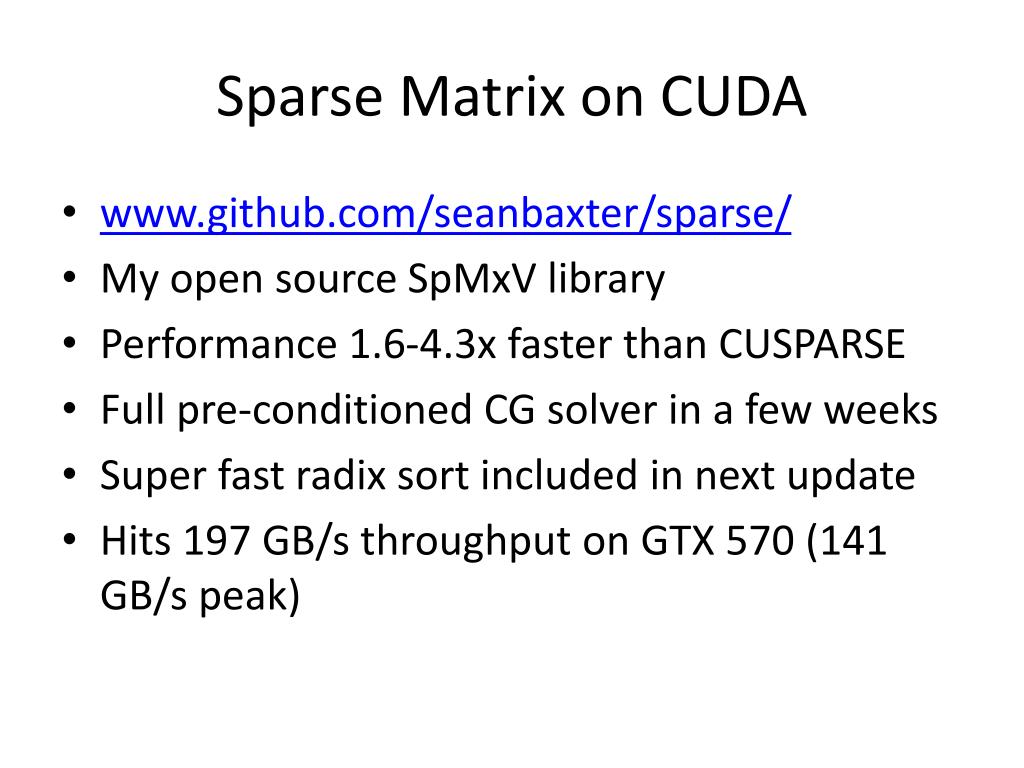 Sparse Matrix on CUDA • www.github.com/seanbaxter/sparse/ • My open source SpMxV library • Performance 1.6-4.3x faster than CUSPARSE • Full pre-conditioned CG solver in a few weeks • Super fast radix sort included in next update • Hits 197 GB/s throughput on GTX 570 (141 GB/s peak)