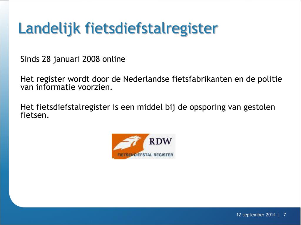 Landelijk fietsdiefstalregister Sinds 28 januari 2008 online Het register wordt door de Nederlandse fietsfabrikanten en de politie van informatie voorzien. Het fietsdiefstalregister is een middel bij de opsporing van gestolen fietsen.