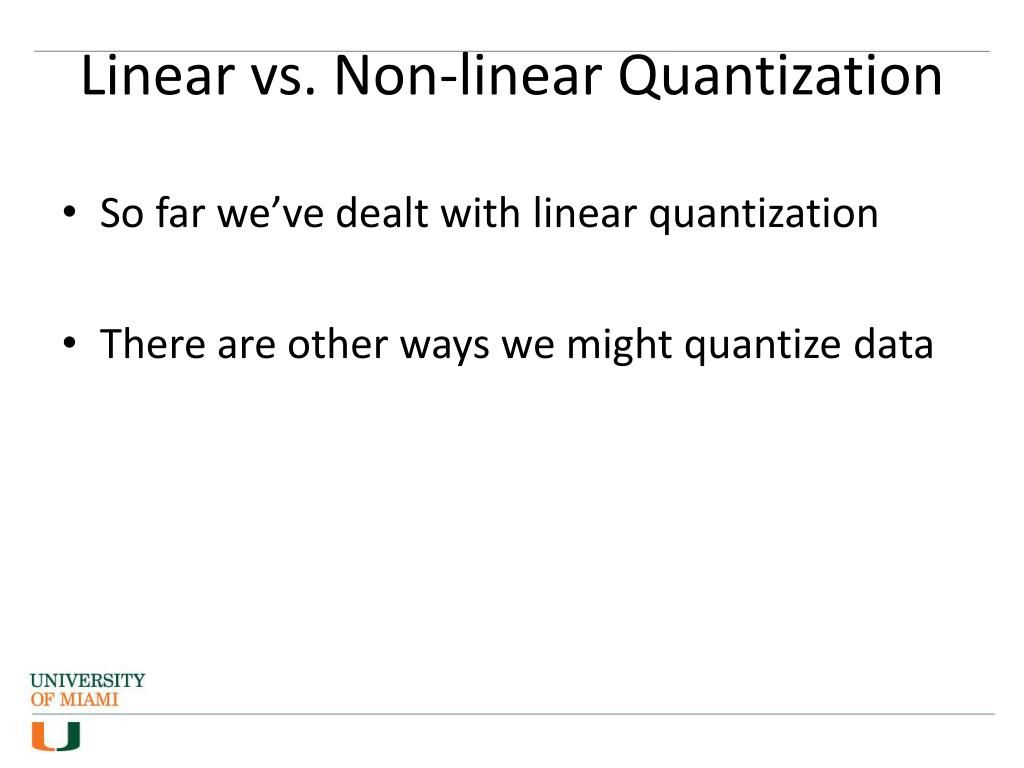 Linear vs. Non-linear Quantization • So far we’ve dealt with linear quantization • There are other ways we might quantize data