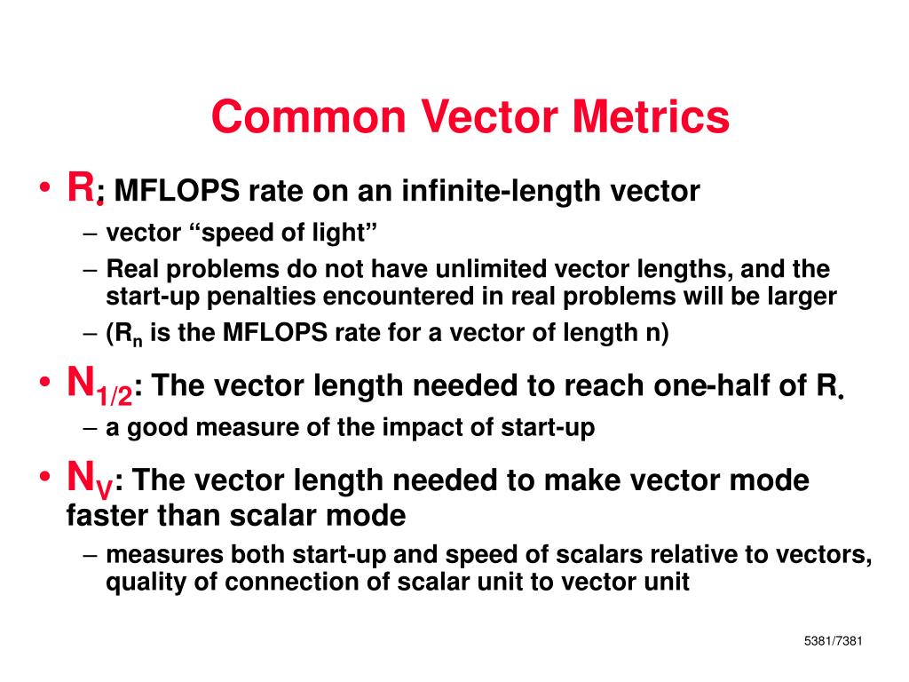 Common Vector Metrics • R: MFLOPS rate on an infinite-length vector • vector “speed of light” • Real problems do not have unlimited vector lengths, and the start-up penalties encountered in real problems will be larger • (Rn is the MFLOPS rate for a vector of length n) • N1/2: The vector length needed to reach one-half of R • a good measure of the impact of start-up • NV: The vector length needed to make vector mode faster than scalar mode • measures both start-up and speed of scalars relative to vectors, quality of connection of scalar unit to vector unit