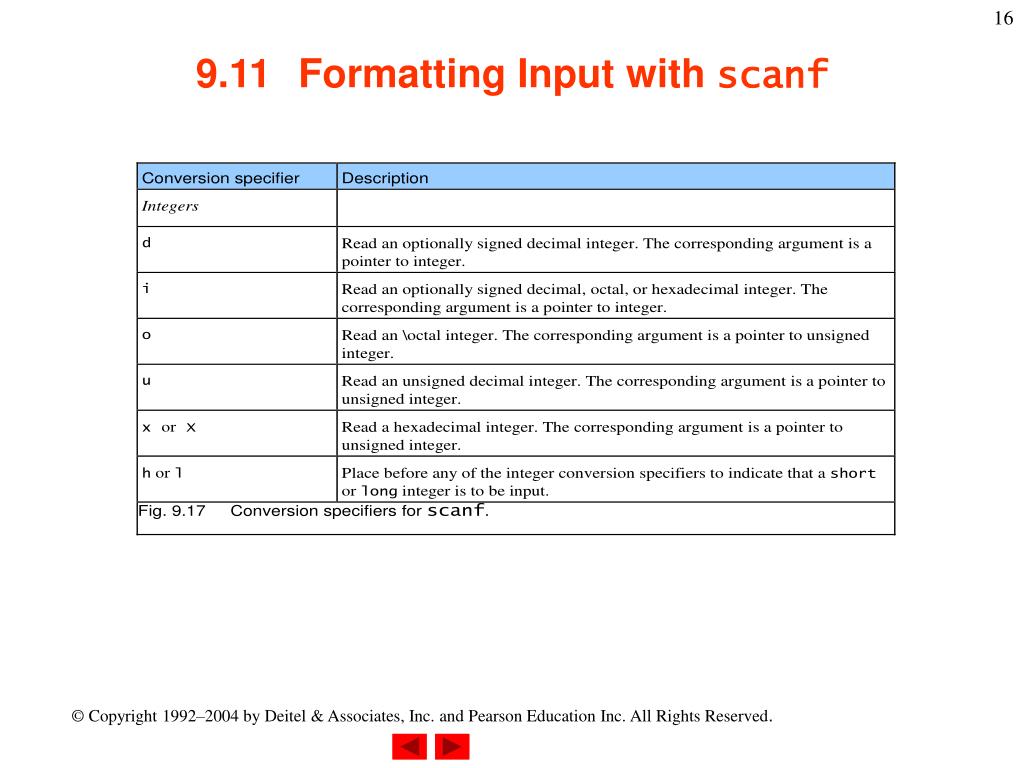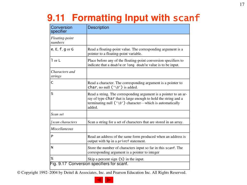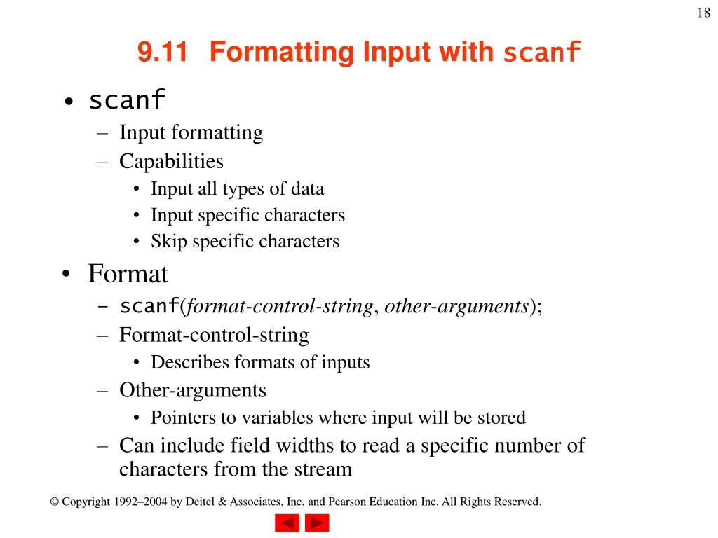 9.11 Formatting Input with scanf • scanf • Input formatting • Capabilities • Input all types of data • Input specific characters • Skip specific characters • Format • scanf(format-control-string, other-arguments); • Format-control-string • Describes formats of inputs • Other-arguments • Pointers to variables where input will be stored • Can include field widths to read a specific number of characters from the stream