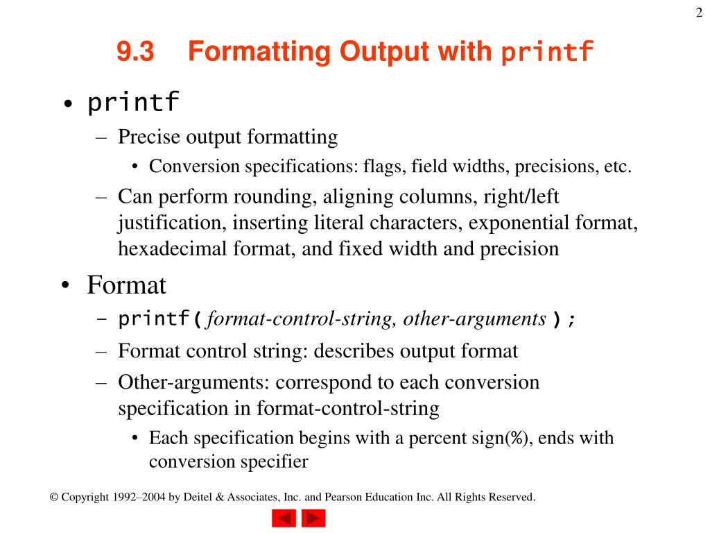 9.3 Formatting Output withprintf • printf • Precise output formatting • Conversion specifications: flags, field widths, precisions, etc. • Can perform rounding, aligning columns, right/left justification, inserting literal characters, exponential format, hexadecimal format, and fixed width and precision • Format • printf(format-control-string, other-arguments); • Format control string: describes output format • Other-arguments: correspond to each conversion specification in format-control-string • Each specification begins with a percent sign(%), ends with conversion specifier