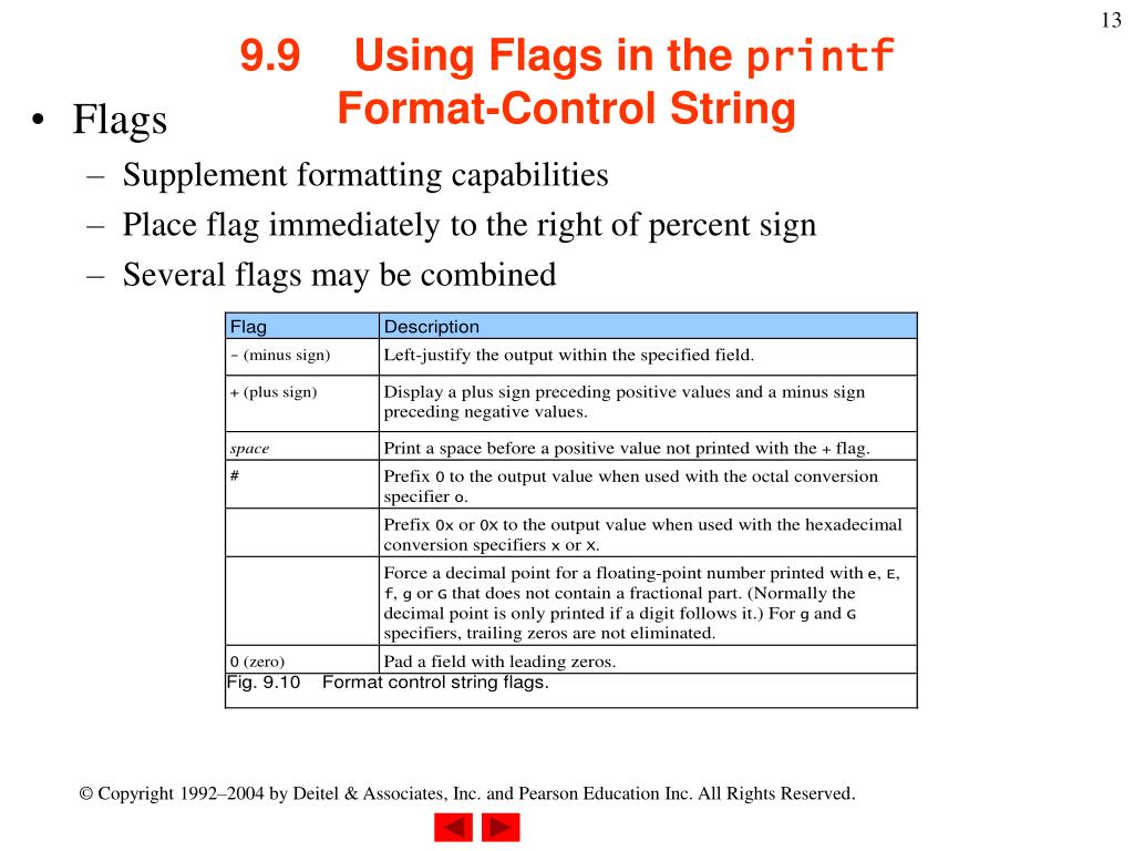 9.9 Using Flags in the printfFormat-Control String • Flags • Supplement formatting capabilities • Place flag immediately to the right of percent sign • Several flags may be combined