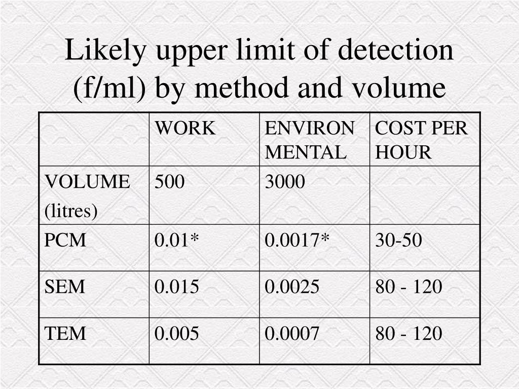 PCM Limitations • PCM has limited detection due to background counts on blank filters (0.01 f/ml); • No knowledge of fibre types; • Only an “index of exposure”