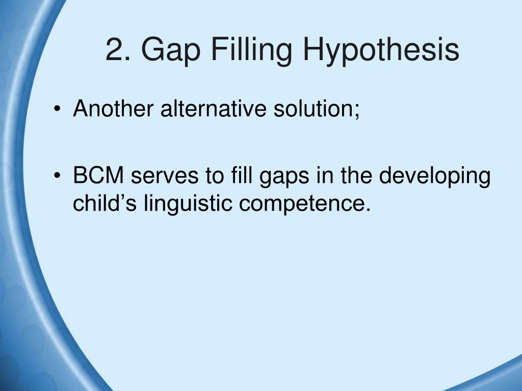 2. Gap Filling Hypothesis Another alternative solution; BCM serves to fill the gaps in the developing child’s linguistic competence.