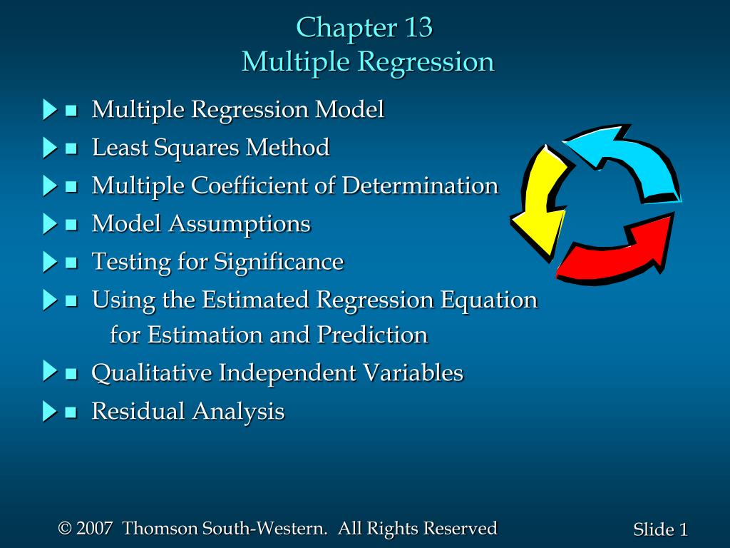 Chapter 13 Multiple Regression. Multiple Regression Model. Least Squares Method. Multiple Coefficient of Determination. Model Assumptions. Testing for Significance. Using the Estimated Regression Equation for Estimation and Prediction. Qualitative Independent Variables.