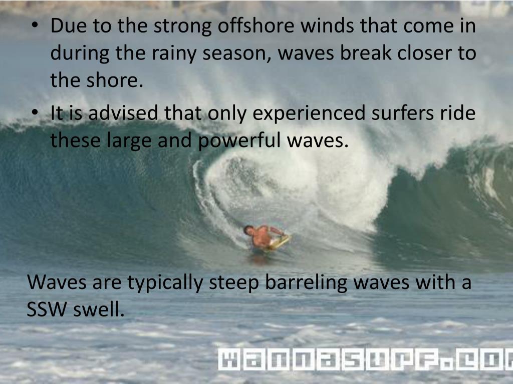 Due to the strong offshore winds that come in during the rainy season, waves break closer to the shore. • It is advised that only experienced surfers ride these large and powerful waves. Waves are typically steep barreling waves with a SSW swell.