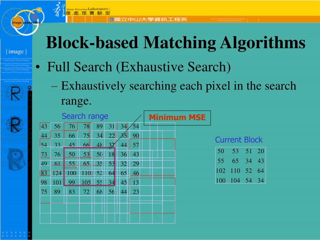 Block-based Matching Algorithms • Full Search (Exhaustive Search) • Exhaustively searching each pixel in the search range. Search range Minimum MSE Current Block