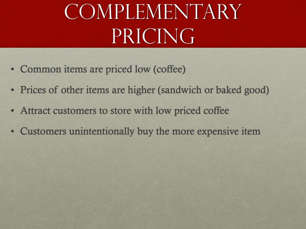 Complementary Pricing • Common items are priced low (coffee) • Prices of other items are higher (sandwich or baked good) • Attract customers to store with low priced coffee • Customers unintentionally buy the more expensive item