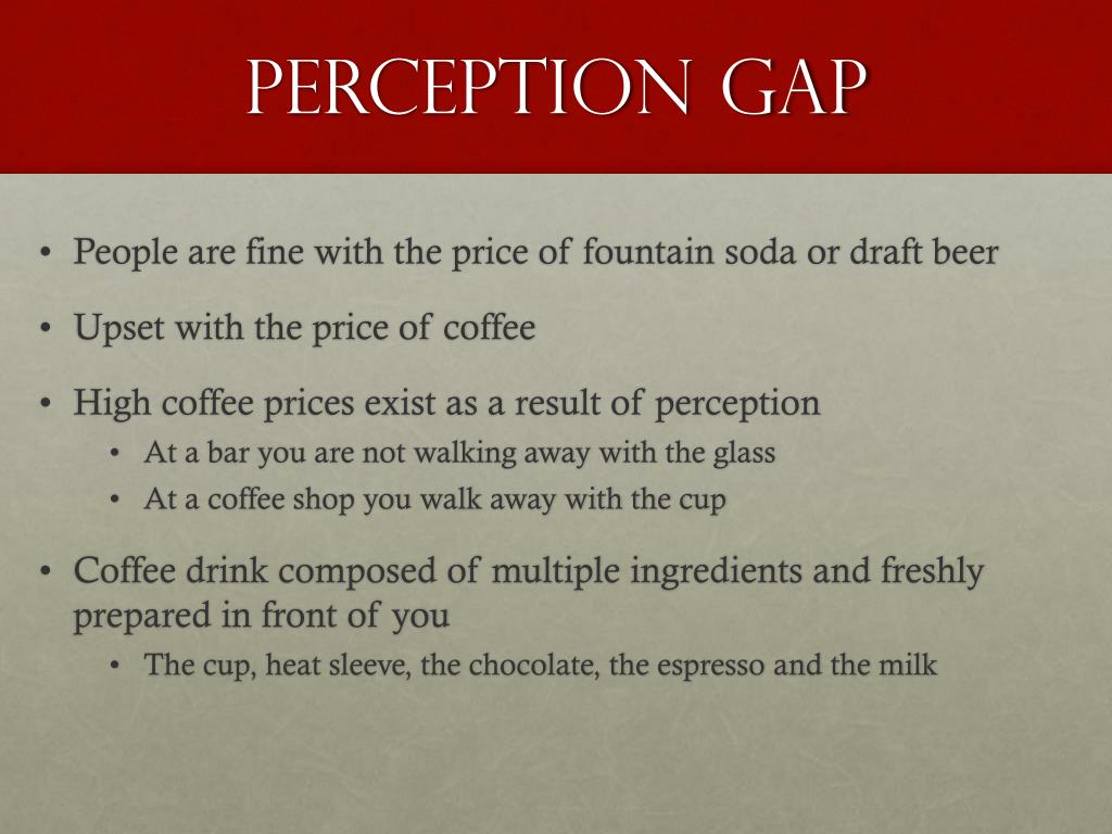 Perception Gap • People are fine with the price of fountain soda or draft beer • Upset with the price of coffee • High coffee prices exist as a result of perception • At a bar you are not walking away with the glass • At a coffee shop you walk away with the cup • Coffee drink composed of multiple ingredients and freshly prepared in front of you • The cup, heat sleeve, the chocolate, the espresso and the milk