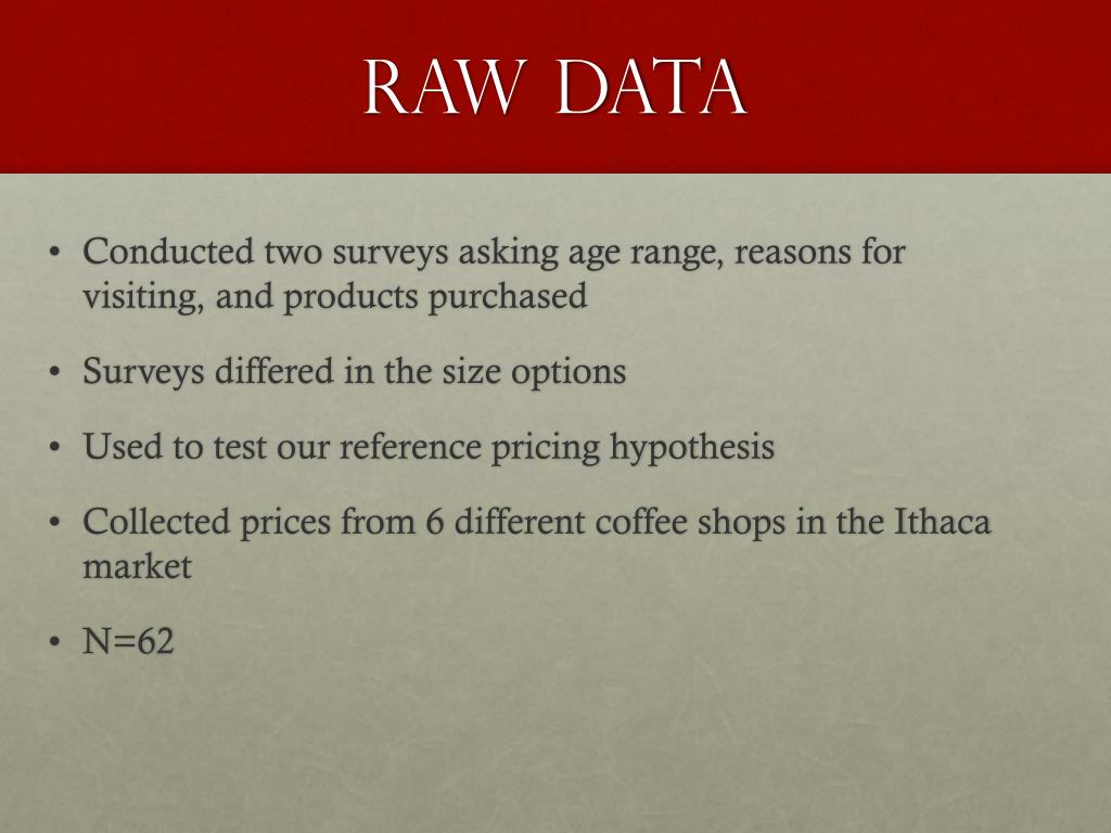 Raw Data • Conducted two surveys asking age range, reasons for visiting, and products purchased • Surveys differed in the size options • Used to test our reference pricing hypothesis • Collected prices from 6 different coffee shops in the Ithaca market • N=62