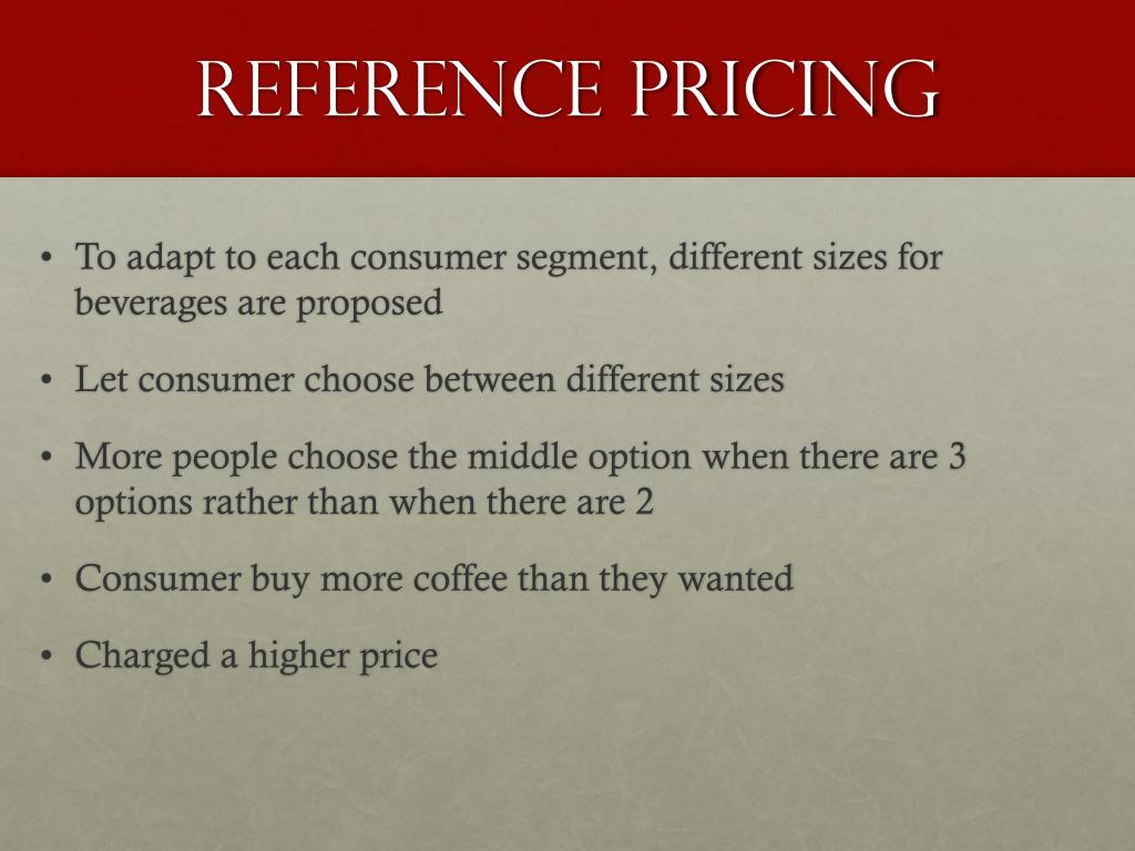 Reference pricing • To adapt to each consumer segment, different sizes for beverages are proposed • Let consumer choose between different sizes • More people choose the middle option when there are 3 options rather than when there are 2 • Consumer buy more coffee than they wanted • Charged a higher price
