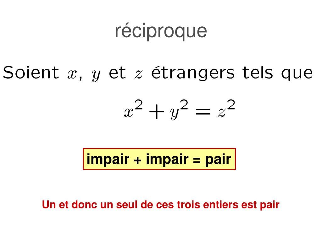 réciproque impair + impair = pair Un et donc un seul de ces trois entiers est pair