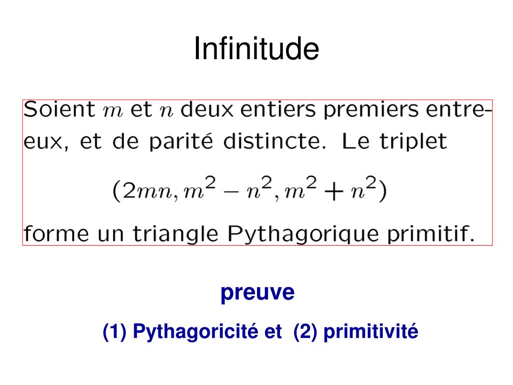 Infinitude preuve (1) Pythagoricité et (2) primitivité