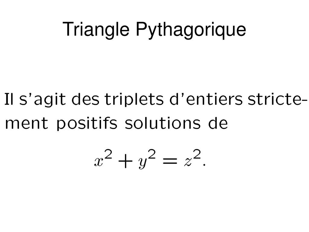 Arithmétiques de Diophante • Platon-400. Il existe une infinité de classes de triangles pythagoriques. • Euclide. caractérisation de toutes les solutions de x2 + y2 = z2. • Diophante. généralisations, nouvelles questions, nouvelles équations. équations diophantiennes.