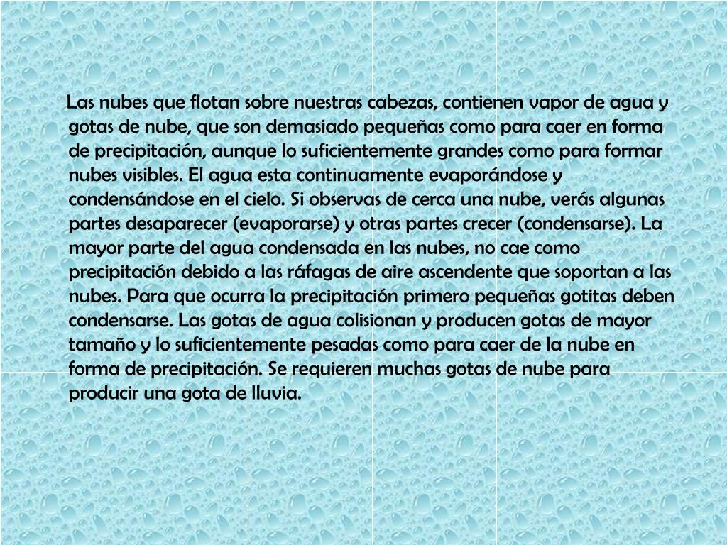 Las nubes que flotan sobre nuestras cabezas, contienen vapor de agua y gotas de nube, que son demasiado pequeñas como para caer en forma de precipitación, aunque lo suficientemente grandes como para formar nubes visibles. El agua esta continuamente evaporándose y condensándose en el cielo. Si observas de cerca una nube, verás algunas partes desaparecer (evaporarse) y otras partes crecer (condensarse). La mayor parte del agua condensada en las nubes, no cae como precipitación debido a las ráfagas de aire ascendente que soportan a las nubes. Para que ocurra la precipitación primero pequeñas gotitas deben condensarse. Las gotas de agua colisionan y producen gotas de mayor tamaño y lo suficientemente pesadas como para caer de la nube en forma de precipitación. Se requieren muchas gotas de nube para producir una gota de lluvia.