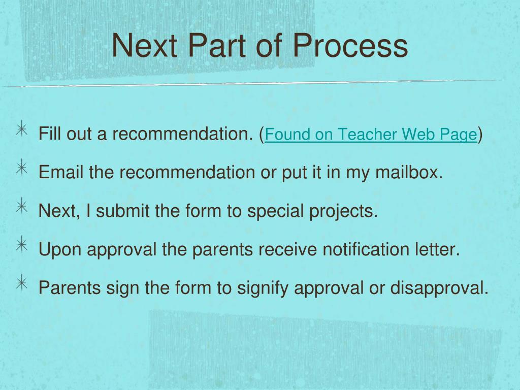 Next Part of Process • Fill out a recommendation. (Found on Teacher Web Page) • Email the recommendation or put it in my mailbox. • Next, I submit the form to special projects. • Upon approval the parents receive notification letter. • Parents sign the form to signify approval or disapproval.