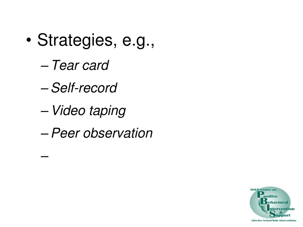 Strategies, e.g., • Tear card • Self-record • Video taping • Peer observation