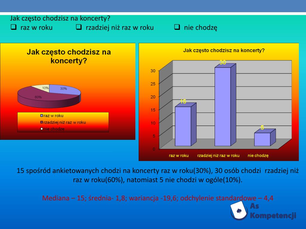 Jak często chodzisz na koncerty? raz w roku rzadziej niż raz w roku nie chodzę 15 spośród ankietowanych chodzi na koncerty raz w roku(30%), 30 osób chodzi rzadziej niż raz w roku(60%), natomiast 5 nie chodzi w ogóle(10%). Mediana – 15; średnia- 1,8; wariancja -19,6; odchylenie standardowe – 4,4