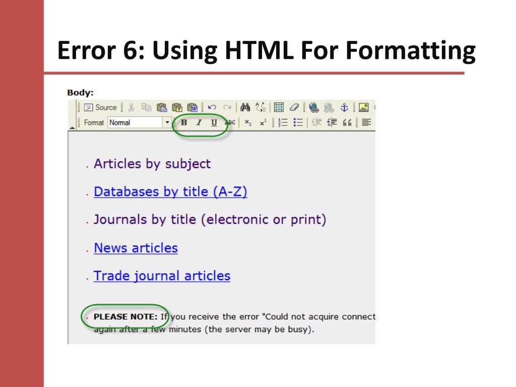 Error 10: Tables • Make sense if read linearly • Have captions or summaries <table summary=“Opening hours for main and branch libraries during fall term”> <caption>Opening Hours</caption> • Column & row headings <tr> <th scope=“row”>Opening Hours</th> <td>9am</td>