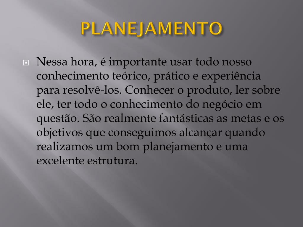 PLANEJAMENTO • Nessa hora, é importante usar todo nosso conhecimento teórico, prático e experiência para resolvê-los. Conhecer o produto, ler sobre ele, ter todo o conhecimento do negócio em questão. São realmente fantásticas as metas e os objetivos que conseguimos alcançar quando realizamos um bom planejamento e uma excelente estrutura.