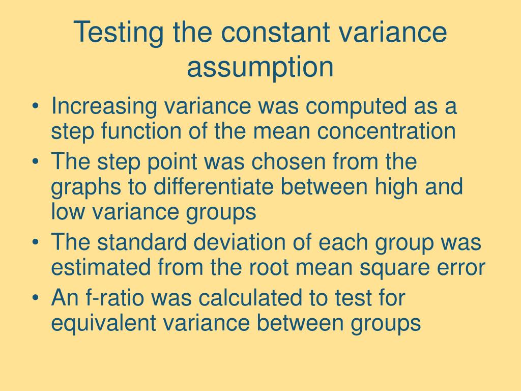 Testing the constant variance assumption • Increasing variance was computed as a step function of the mean concentration • The step point was chosen from the graphs to differentiate between high and low variance groups • The standard deviation of each group was estimated from the root mean square error • An f-ratio was calculated to test for equivalent variance between groups