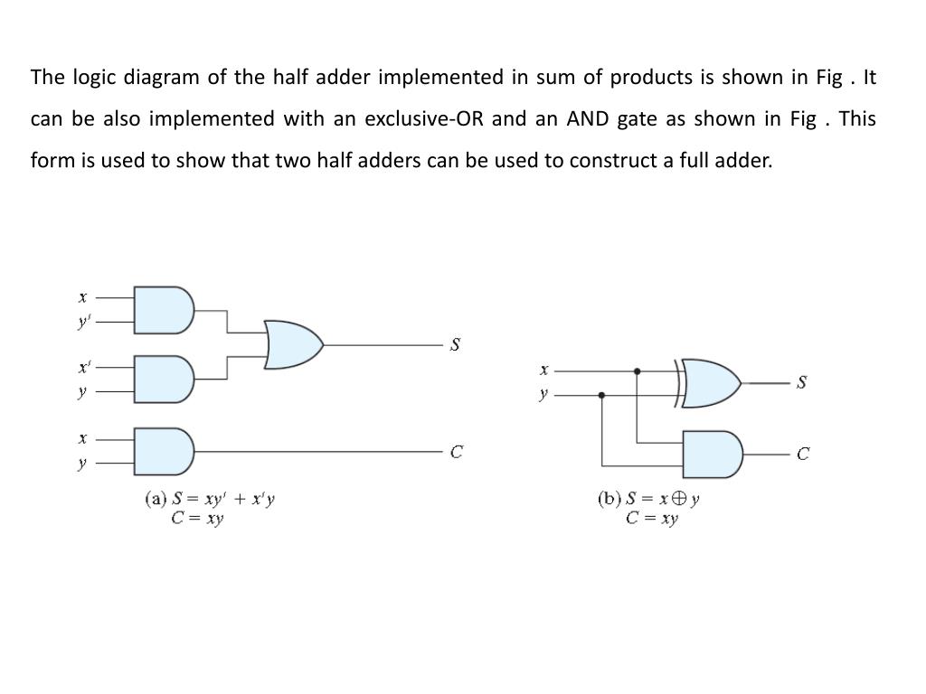 The logic diagram of the half adder implemented in sum of products is shown in Fig . It can be also implemented with an exclusive-OR and an AND gate as shown in Fig . This form is used to show that two half adders can be used to construct a full adder.
