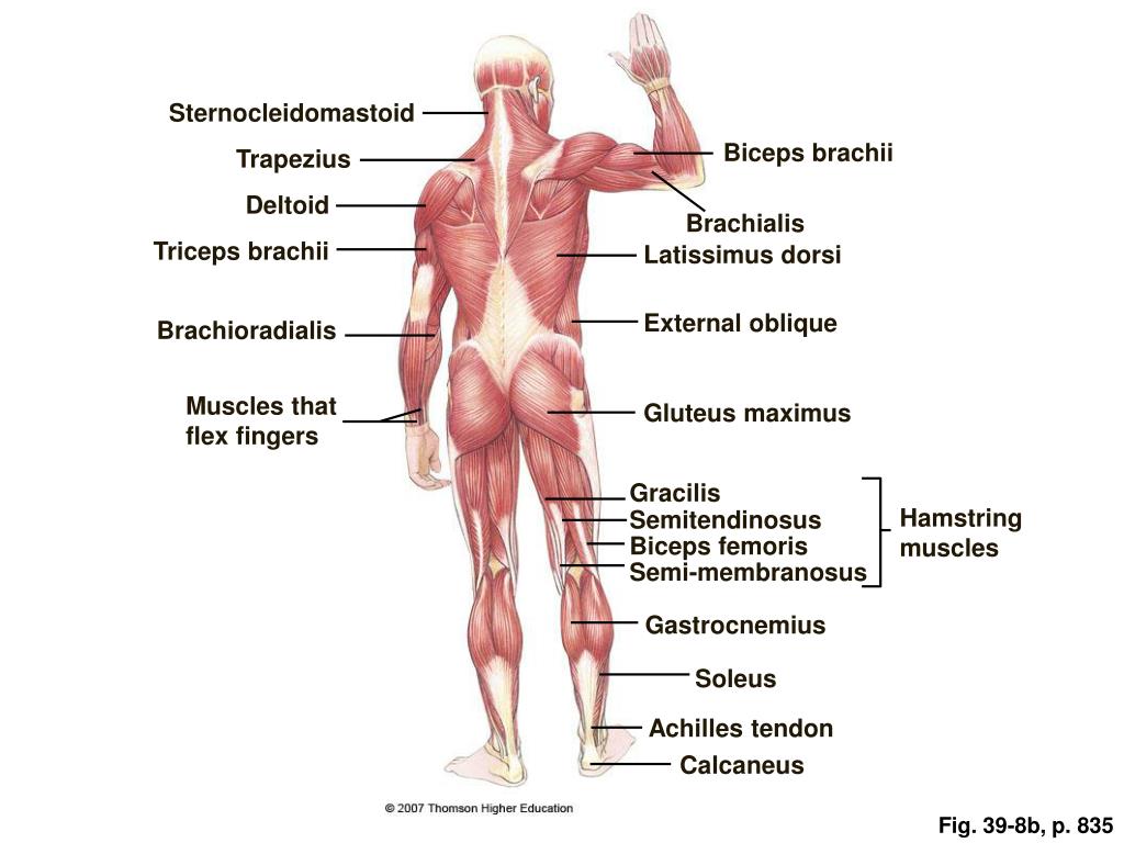 Sternocleidomastoid Biceps brachii Trapezius Deltoid Brachialis Triceps brachii Latissimus dorsi External oblique Brachioradialis Muscles that flex fingers Gluteus maximus Gracilis Semitendinosus Hamstring muscles Biceps femoris Semi-membranosus Gastrocnemius Soleus Achilles tendon Calcaneus Fig. 39-8b, p. 835