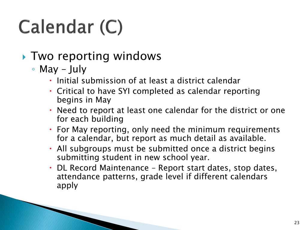 Calendar (C) • Two reporting windows • May – July • Initial submission of at least a district calendar • Critical to have SYI completed as calendar reporting begins in May • Need to report at least one calendar for the district or one for each building • For May reporting, only need the minimum requirements for a calendar, but report as much detail as available. • All subgroups must be submitted once a district begins submitting student in new school year. • DL Record Maintenance – Report start dates, stop dates, attendance patterns, grade level if different calendars apply