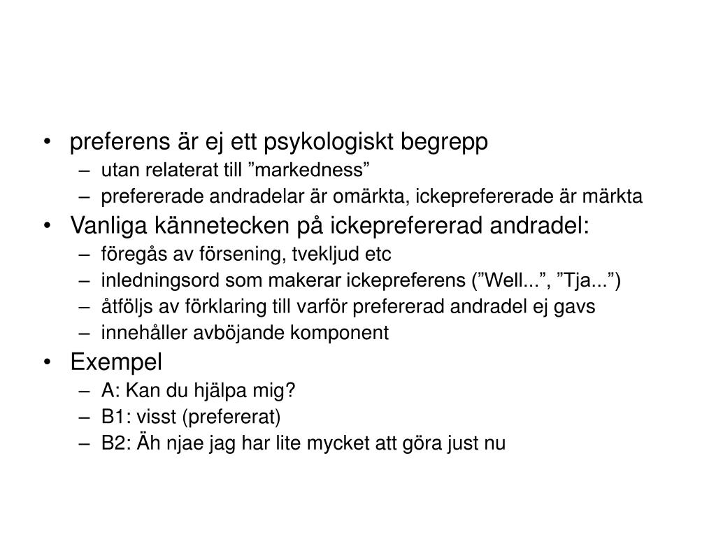 preferens är ej ett psykologiskt begrepp • utan relaterat till ”markedness” • prefererade andradelar är omärkta, ickeprefererade är märkta • Vanliga kännetecken på ickeprefererad andradel: • föregås av försening, tvekljud etc • inledningsord som makerar ickepreferens (”Well...”, ”Tja...”) • åtföljs av förklaring till varför prefererad andradel ej gavs • innehåller avböjande komponent • Exempel • A: Kan du hjälpa mig? • B1: visst (prefererat) • B2: Äh njae jag har lite mycket att göra just nu