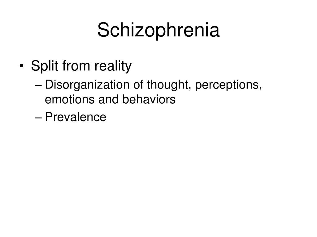 Schizophrenia • Split from reality • Disorganization of thought, perceptions, emotions and behaviors • Prevalence