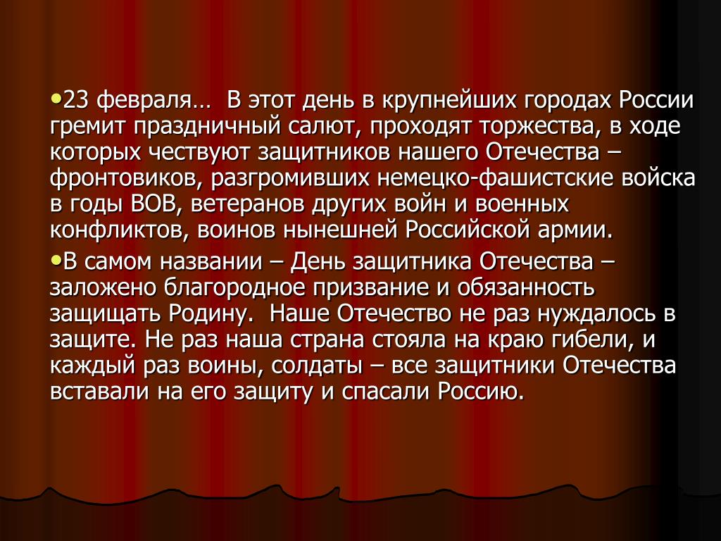 23 февраля… В этот день в крупнейших городах России гремит праздничный салют, проходят торжества, в ходе которых чествуют защитников нашего Отечества – фронтовиков, разгромивших немецко-фашистские войска в годы ВОВ, ветеранов других войн и военных конфликтов, воинов нынешней Российской армии. • В самом названии – День защитника Отечества – заложено благородное призвание и обязанность защищать Родину. Наше Отечество не раз нуждалось в защите. Не раз наша страна стояла на краю гибели, и каждый раз воины, солдаты – все защитники Отечества вставали на его защиту и спасали Россию.