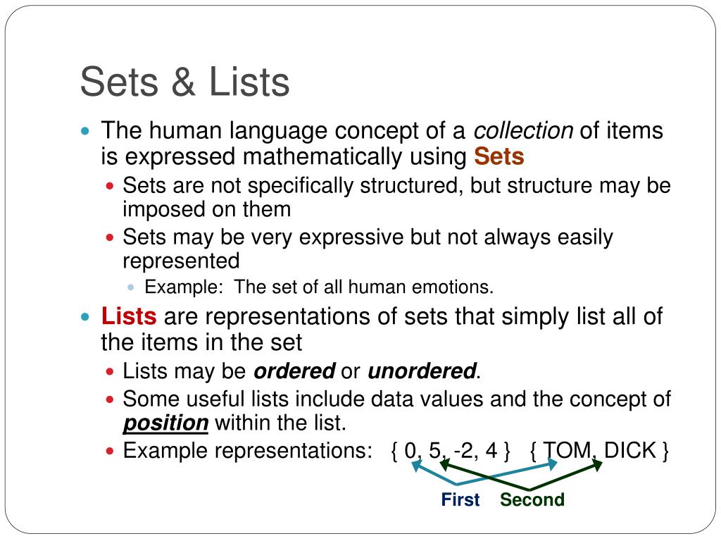Sets & Lists • The human language concept of a collection of items is expressed mathematically using Sets • Sets are not specifically structured, but structure may be imposed on them • Sets may be very expressive but not always easily represented • Example: The set of all human emotions. • Lists are representations of sets that simply list all of the items in the set • Lists may be ordered or unordered. • Some useful lists include data values and the concept of position within the list. • Example representations: { 0, 5, -2, 4 } { TOM, DICK } First Second