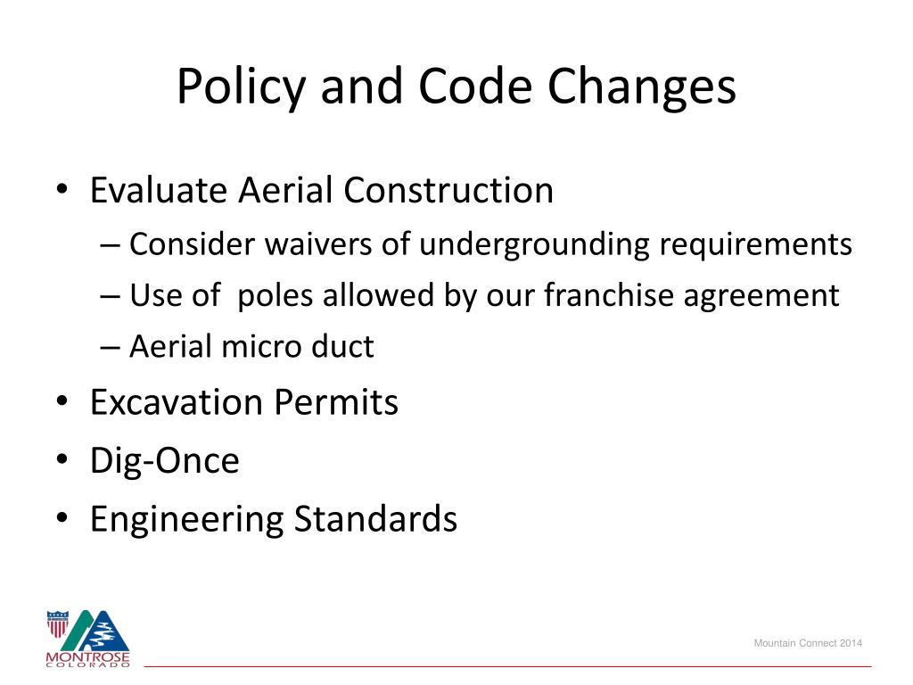 Policy and Code Changes • Evaluate Aerial Construction • Consider waivers of undergrounding requirements • Use of poles allowed by our franchise agreement • Aerial micro duct • Excavation Permits • Dig-Once • Engineering Standards