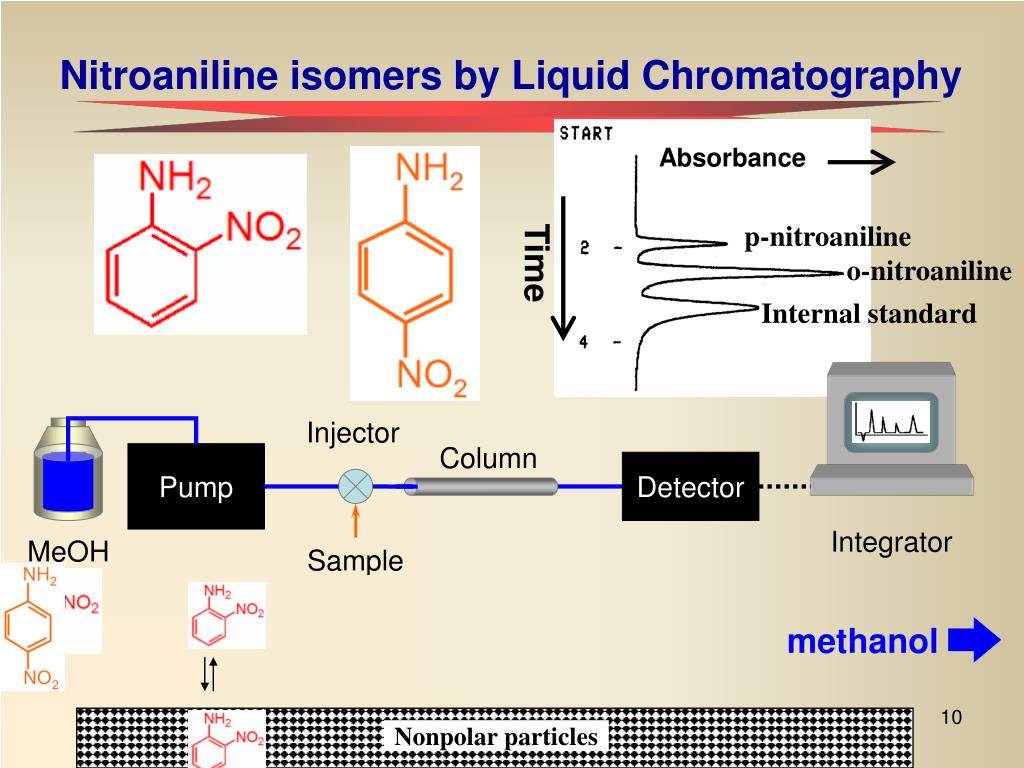 Absorbance Time Sample (20mL) Injector Column Pump Detector Integrator MeOH methanol Nonpolar particles Nitroaniline isomers by Liquid Chromatography p-nitroaniline o-nitroaniline Internal standard