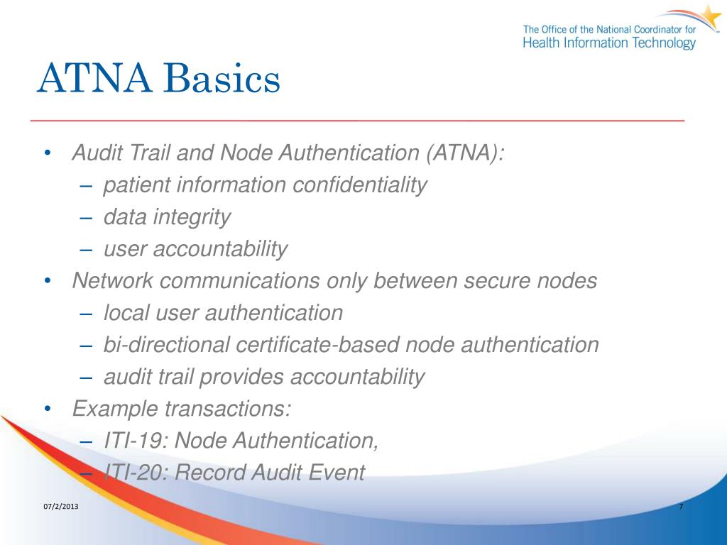 ATNA Details • ITI Example Transactions: • Node Authentication (ITI-19) • Record Audit Event (ITI-20) • Secure Communications: • Transport Layer Security (RFC 2246) • Audit Log Transport: • Syslog Protocol (RFC 5424) • Transmission of Syslog Messages over TLS (RFC 5425) • Audit Log Messages: • Security Audit and Access Accountability Message XML Data Definitions for Healthcare Applications (RFC 3881)