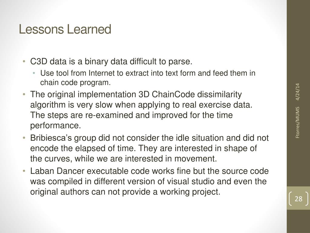 Lessons Learned • C3D data is a binary data difficult to parse. • Use tool from Internet to extract into text form and feed them in chain code program. • The original implementation 3D ChainCode dissimilarity algorithm is very slow when applying to real exercise data. The steps are re-examined and improved for the time performance. • Bribiesca’s group did not consider the idle situation and did not encode the elapsed of time. They are interested in shape of the curves, while we are interested in movement. • Laban Dancer executable code works fine but the source code was compiled in different version of visual studio and even the original authors can not provide a working project. Ftorres/MUMS