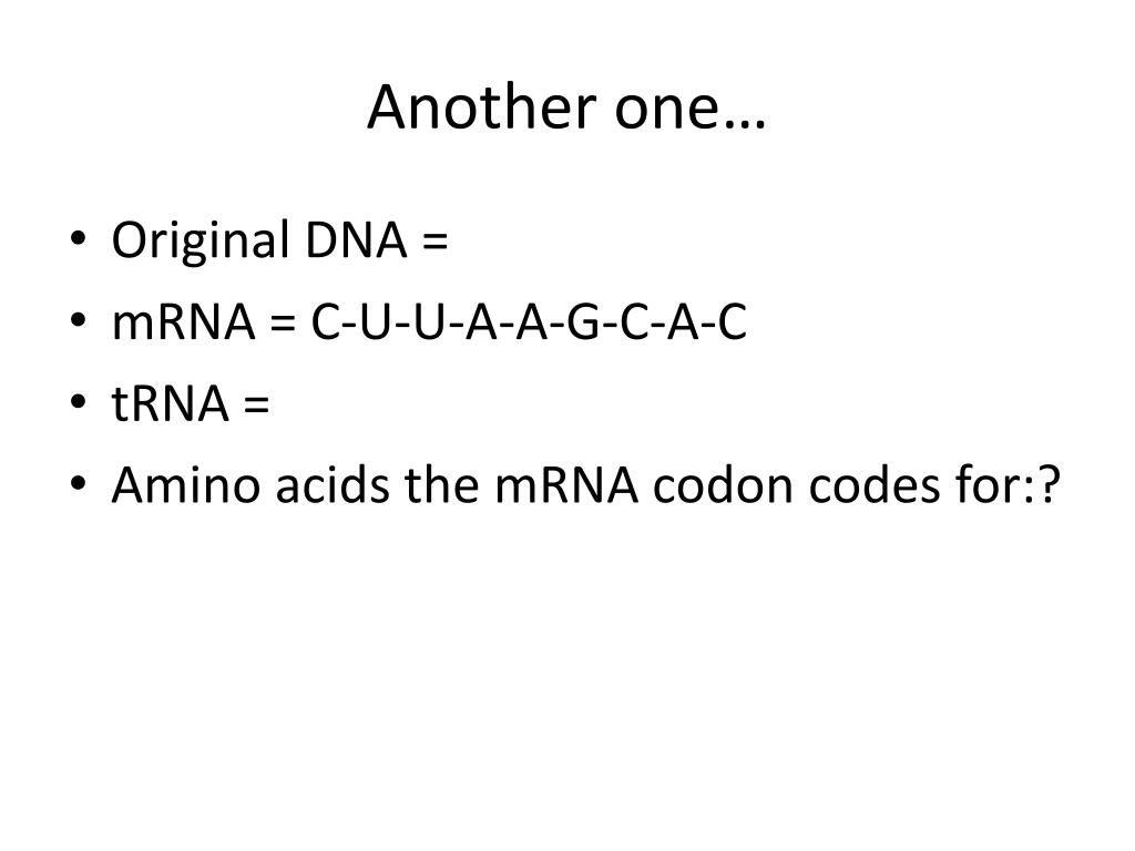 Another one… • Original DNA = • mRNA = C-U-U-A-A-G-C-A-C • tRNA = • Amino acids the mRNA codon codes for:?