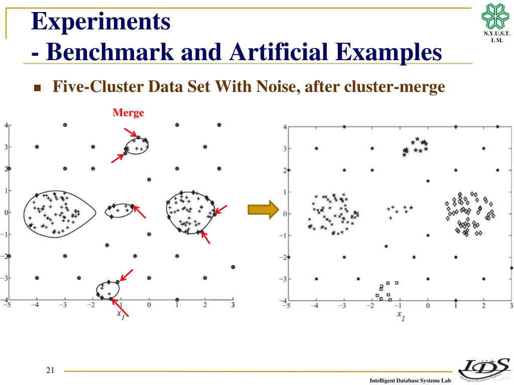 Experiments - Benchmark and Artificial Examples • Five-Cluster Data Set With Noise, after cluster-merge Merge 21