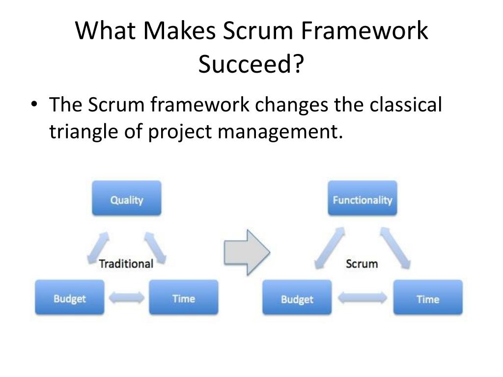 What Makes Scrum Framework Succeed? • The Scrum framework changes the classical triangle of project management.