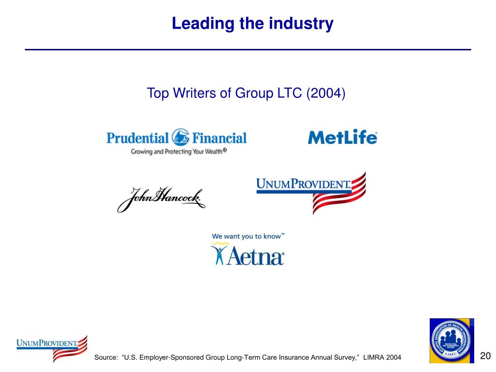 Leading the industry Top Writers of Group LTC (2004) Source: “U.S. Employer-Sponsored Group Long-Term Care Insurance Annual Survey,” LIMRA 2004